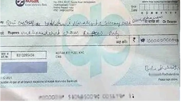 चेक दान करने की घटना अब सोशल मीडिया पर वायरल हो रही है। मंदिर में आए श्रद्धालु ने दान के तौर पर अपने चेक में सबसे पहले 10 रुपये लिखे और बाद में वह उसपर और राशि बढ़ाता चला गया। शुरुआत में मंदिर प्रशासन इसको देखकर हैरान हो गए, क्योंकि अभी तक मंदिर को इतना बड़ा दान नहीं मिला था।
